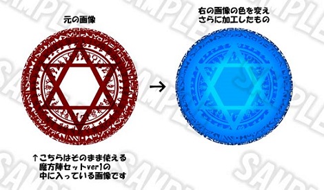 私は禍々しい感じっぽい魔方陣とかが好きでそっちばっかり作ってしまう傾向にあるのですが、たまには違うのにしてみようと現在販売しているそのまま使える魔方陣セットver1に入っている魔方陣の色を変えて、更にぼかしなどの加工をしてみました。